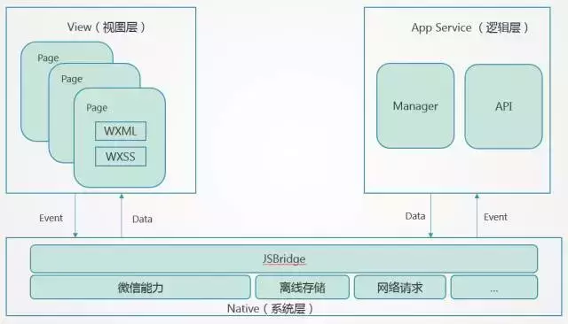 微信小程序View层用来渲染页面结构,AppService层用来逻辑处理、数据请求、接口调用,它们在两个进程(两个Webview)里运行。